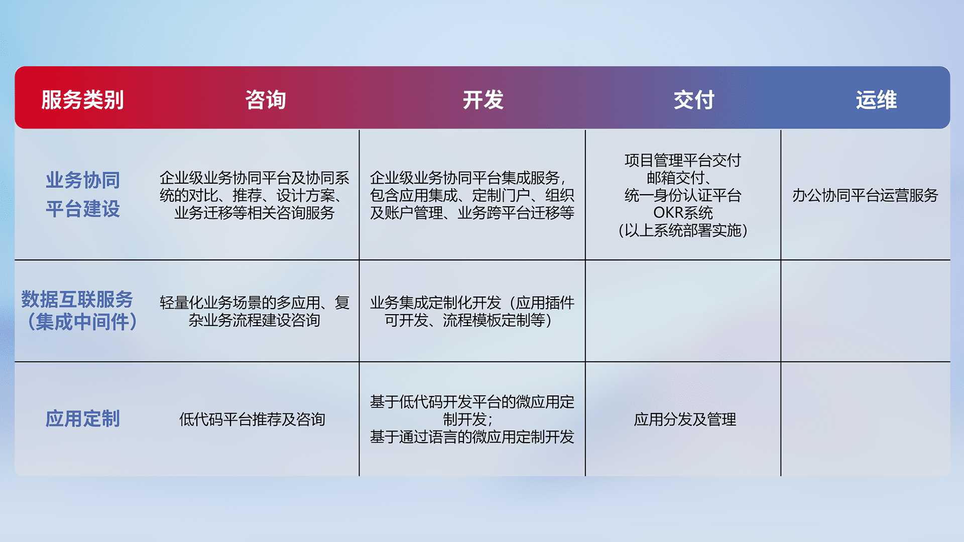 针对钉钉、、、企微、、IDaas等平台级产品提供产品的规划、、、、方案、、、交付、、、定制化开发等服务,,,,实现如统一协同办公、、、、智能客户服务、、混合会议管理、、智能数据查询、、、、等业务场景,,实现数字化转型。。