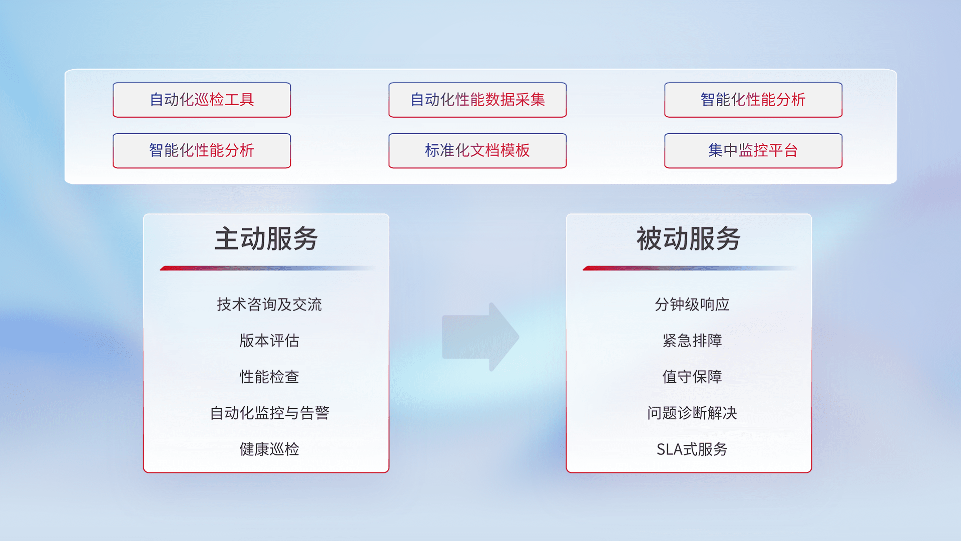 智能化工具和标准化文档,,,保障服务质量,,,提供主动服务(包含技术咨询、、、、版本评估、、、性能检查、、、、自动化监控与告警、、健康巡检)和被动服务包含(分钟级响应、、、紧急排障、、、、值守保障、、、问题诊断解决、、SLA服务)。。